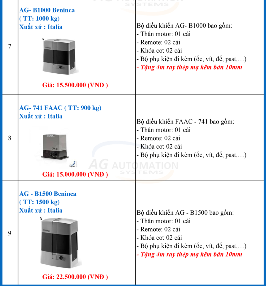 Bảng giá Motor cổng tự động và phụ kiện, bảng giá chiết khấu các dòng motor cổng tự động của công ty AG dành cho đại lý trên toàn Quốc